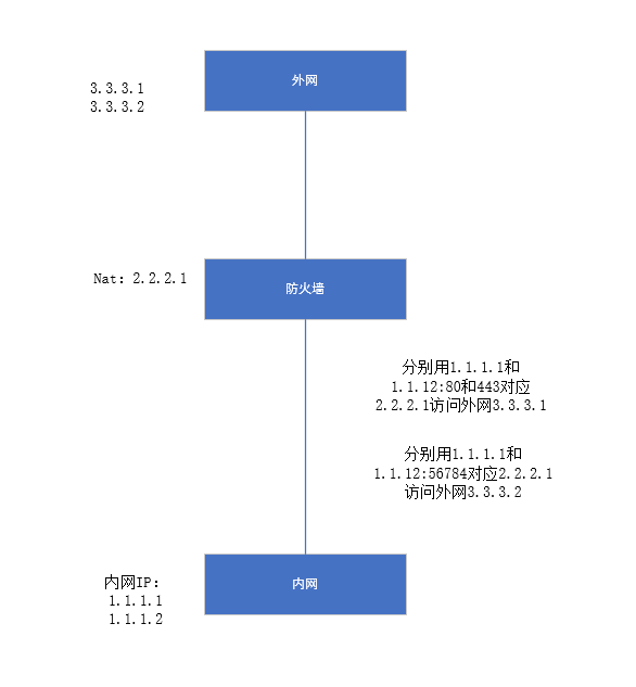 防火墙上利用nat与外网访问,该natIP对应两个不同的外网访问,在防火墙上该如何配置。例如我的内网地址是1.1.1.1和1.1.1.2,利用nat转换的IP是2.2.2.1,对端的外网的IP是3.3.3.1和3.3.3.2 。利用这个nat转换IP2.2.2.1分别跟3.3.3.1和3.3.3.2访问不同的端口。这个方案是否可行,若行防火墙上该怎么配置呢?