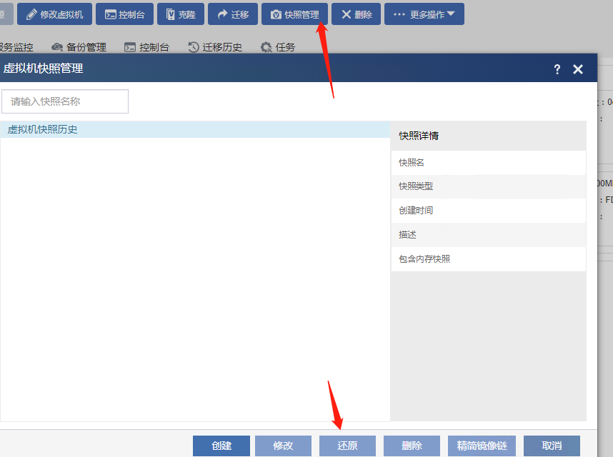 选中该虚拟机,在“快照管理”页签下选中指定的快照进行还原