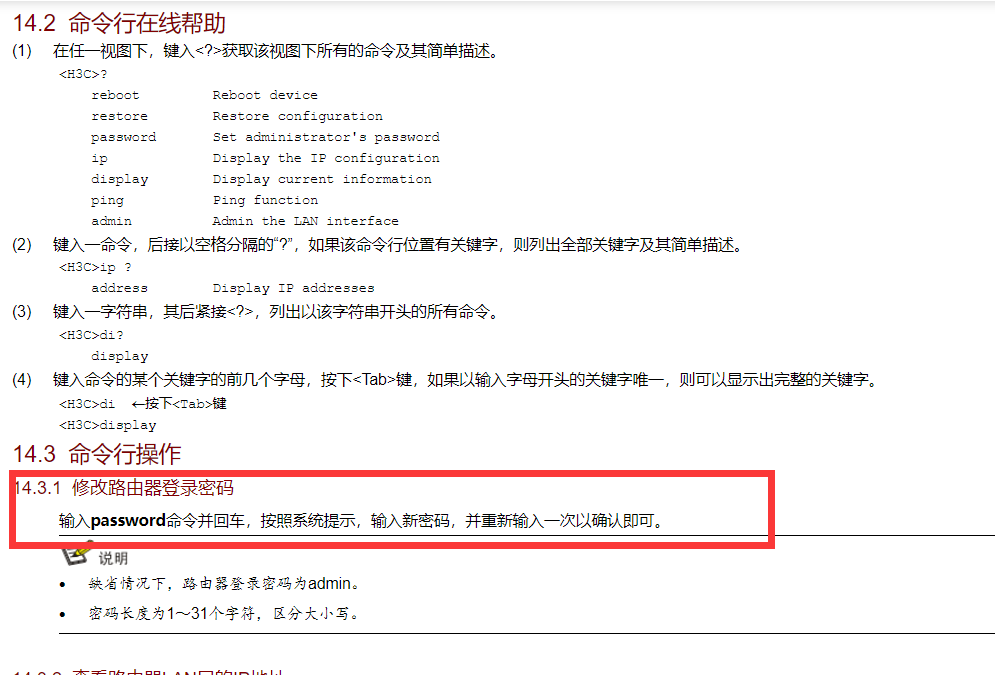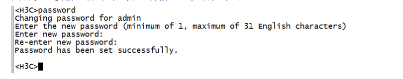 <H3C>提示进入设备命令行,输入password命令并回车,按照系统提示,提示:enter new password(输入新密码),则可以直接输入新密码,并重新输入一次确认即可。