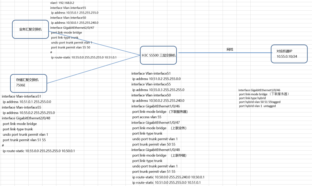 表哥您好,我按照你的思路试了一下,直接下联口也是trunk 允许50 51,但是trunk口直接连服务器配置50 51段地址是无法ping通上联的,印象中trunk口不直连服务器的;2、我设置了hybrid 按照你说的 port hybrid vlan 50 51 55tagged###port hybrid vlan 1 untagged###port hybrid pvid vlan 51,但是这样还是只能通一个网段,pvid 51 则 51 段能通,pvid50,则50段能通,不知道是不是我哪里配置的有问题?