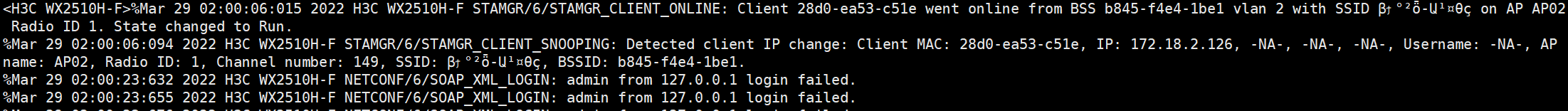 *Mar 29 10:45:49:432 2022 H3C WX2510H-F PORTAL/7/FSM: Auth-SM [172.18.2.126]: Entered state Authenticating. *Mar 29 10:45:49:433 2022 H3C WX2510H-F PORTAL/7/FSM: User-SM[172.18.2.126]: Begin to run. *Mar 29 10:45:49:433 2022 H3C WX2510H-F PORTAL/7/FSM: User-SM [172.18.2.126]: State changed from Initial to Authenticating. *Mar 29 10:45:49:433 2022 H3C WX2510H-F PORTAL/7/FSM: User-SM [172.18.2.126]: State changed from Authenticating to Done. *Mar 29 10:45:49:433 2022 H3C WX2510H-F PORTAL/7/FSM: User-SM[172.18.2.126]: User was destroyed. *Mar 29 10:45:57:118 2022 H3C WX2510H-F PORTAL/7/FSM: Auth-SM: Started to run. *Mar 29 10:45:57:118 2022 H3C WX2510H-F PORTAL/7/FSM: Auth-SM [172.18.2.126]: Entered state Authenticating. *Mar 29 10:45:57:119 2022 H3C WX2510H-F PORTAL/7/FSM: User-SM[172.18.2.126]: Begin to run. *Mar 29 10:45:57:119 2022 H3C WX2510H-F PORTAL/7/FSM: User-SM [172.18.2.126]: State changed from Initial to Authenticating. *Mar 29 10:45:57:119 2022 H3C WX2510H-F PORTAL/7/FSM: User-SM [172.18.2.126]: State changed from Authenticating to Done. *Mar 29 10:45:57:119 2022 H3C WX2510H-F PORTAL/7/FSM: User-SM[172.18.2.126]: User was destroyed. %Mar 29 10:46:26:539 2022 H3C WX2510H-F STAMGR/6/STAMGR_CLIENT_OFFLINE: Client 28d0-ea53-c51e went offline from BSS b845-f4e4-1be1 with SSID β?°??-??¤θ? on AP AP02 Radio ID 1. State changed to Unauth. Reason: Received deauthentication frame in Run state: reason code=1 %Mar 29 10:46:39:765 2022 H3C WX2510H-F STAMGR/6/STAMGR_CLIENT_ONLINE: Client a450-46db-3c03 went online from BSS 00be-d575-b0e1 vlan 2 with SSID β?°??-?????n AP AP01 Radio ID 1. State changed to Run. %Mar 29 10:46:39:767 2022 H3C WX2510H-F STAMGR/6/STAMGR_ROAM_SUCCESS: Client a450-46db-3c03 roamed from BSSID b845-f4e4-1be0 on AP AP02 Radio ID 1 of AC IP 127.0.0.1 to BSSID 00be-d575-b0e1 on AP AP01 Radio ID 1 of AC IP 127.0.0.1 successfully. %Mar 29 10:46:39:768 2022 H3C WX2510H-F STAMGR/6/STAMGR_CLIENT_OFFLINE: Client a450-46db-3c03 went offline from BSS b845-f4e4-1be0 with SSID β?°??-?????n AP AP02 Radio ID 1. State changed to Unauth. Reason: Successfully roamed to another BSS. %Mar 29 10:46:39:769 2022 H3C WX2510H-F STAMGR/6/STAMGR_CLIENT_SNOOPING: Detected client IP change: Client MAC: a450-46db-3c03, IP: 172.18.2.13, -NA-, -NA-, -NA-, Username: -NA-, AP name: AP01, Radio ID: 1, Channel number: 52, SSID: β?°??-?????BSSID: 00be-d575-b0e1.