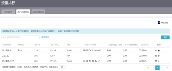 认证用户的用户流量排行功能默认固定开启,无需用户操作。如需查看非认证用户的用户流量排行功能,需先在“全局控制”页面开启相应接口上的用户流量排行功能。