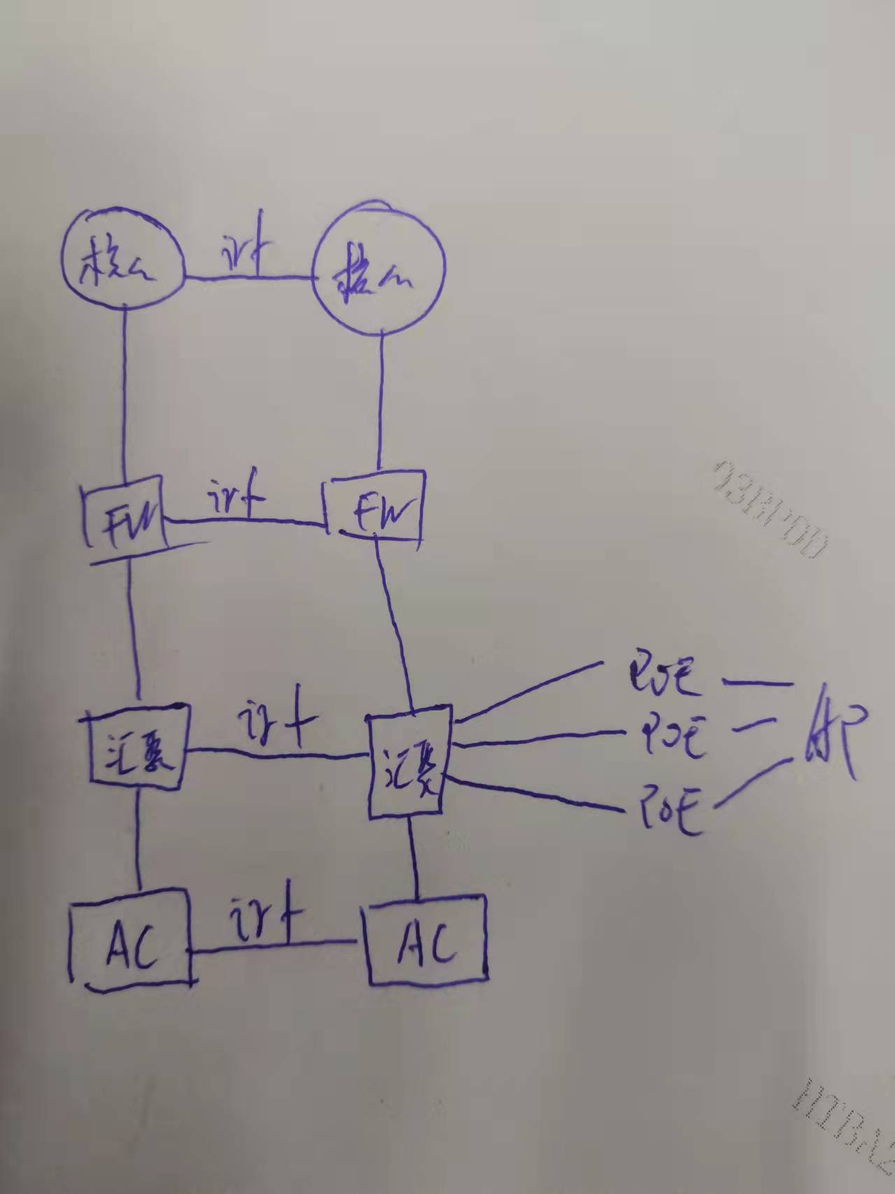 拓扑:防火墙透明IRF双主没配置冗余组,配置了会话同步,无线终端网关在核心,AC旁挂在汇聚交换机。