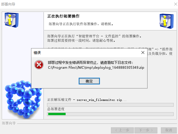 2022-04-02 14:25:14 [WARN ] [Thread-0] [com.h3c.imc.deploy.DMALauncher::checkBatchDeploy(626)] Deploy component iMC-FILEMONITOR failed, return: ERROR, batch deploy interrupted.
