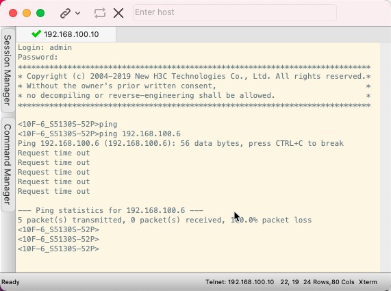 S5120S-52P 出现 管理地址ping不同~但是正常的上联T口跟终端接入的A口 业务流量都正常。就是管理地址无法访问。想问问 有没有其他同学也有这种问题。主要是开了SNMP给zabbix 做数据采集。没有管理地址属实不行。同网段的交换机去ping 也不通