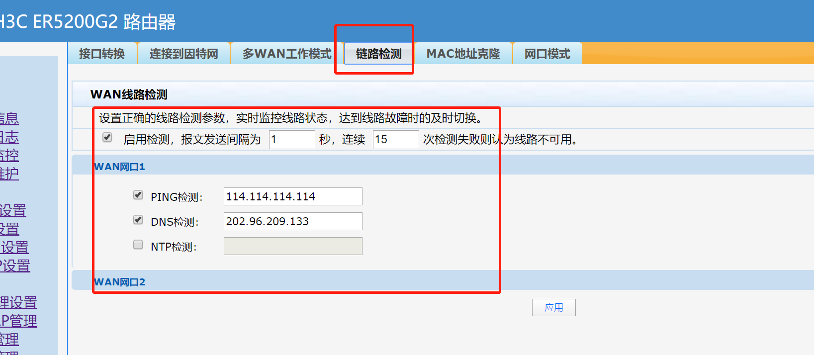 ERG3配置对应WAN口的时候下面有链路探测开启后设备回对于接口状态检查断网自动将接口down后续流量通过另一接口转发,链路负载按照默认的平均分配即可,G2配置WAN口有单独的链路探测功能选项配置和G3一致