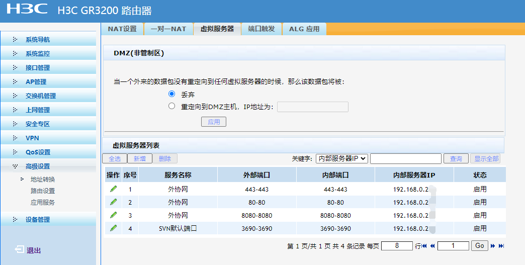 公司买了两台dell的物理服务器,又买了台H3C GR3200的千兆路由,服务器和路由器的线都连接好了,现在端口映射也做好了,局域网内可以访问到,但是外网无法访问,登录到服务器,ping www.baidu.com,ping不通,是不是路由器哪里需要配置一个外网访问的权限?