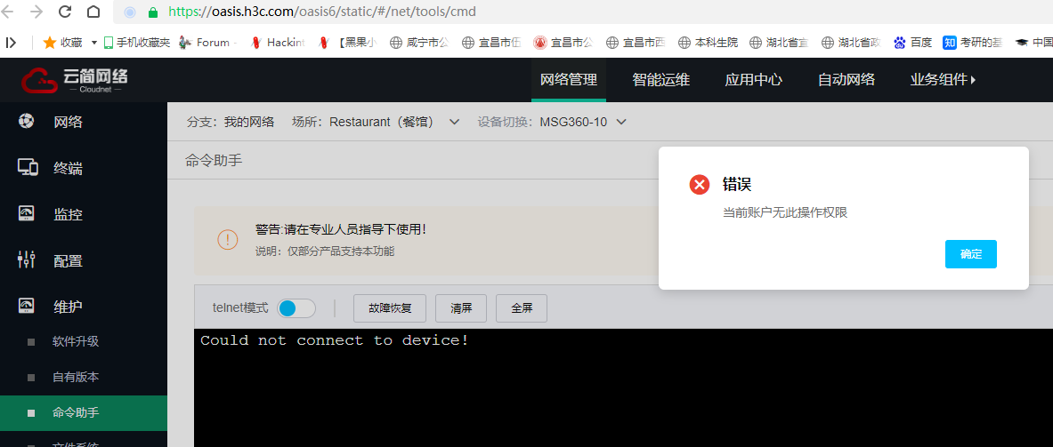 登录添加AC控制器后,使用命令助手,提示当前账户无此操作权限。登录用户肯定是所有权限都有的。