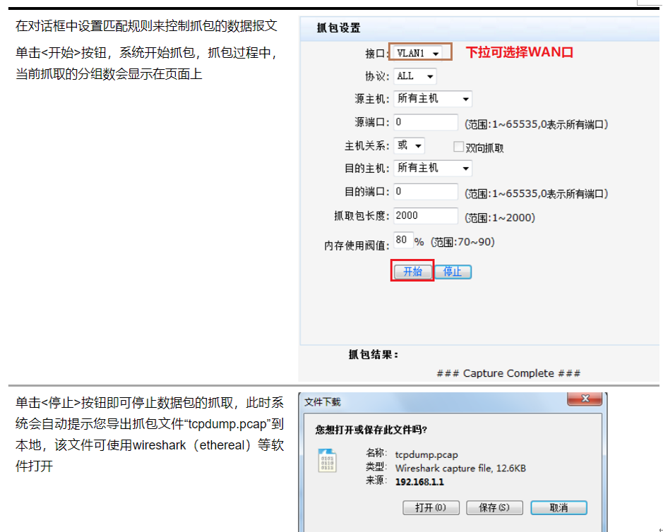 按照上述排查步骤均为解决的话需要收集抓包信息,反馈给新华三400工程师,收集抓包信息步骤如下:点击系统监控→网络维护→抓包工具,接口先选择对应的WAN口,点击开始,建议抓取时间10S-30S以上