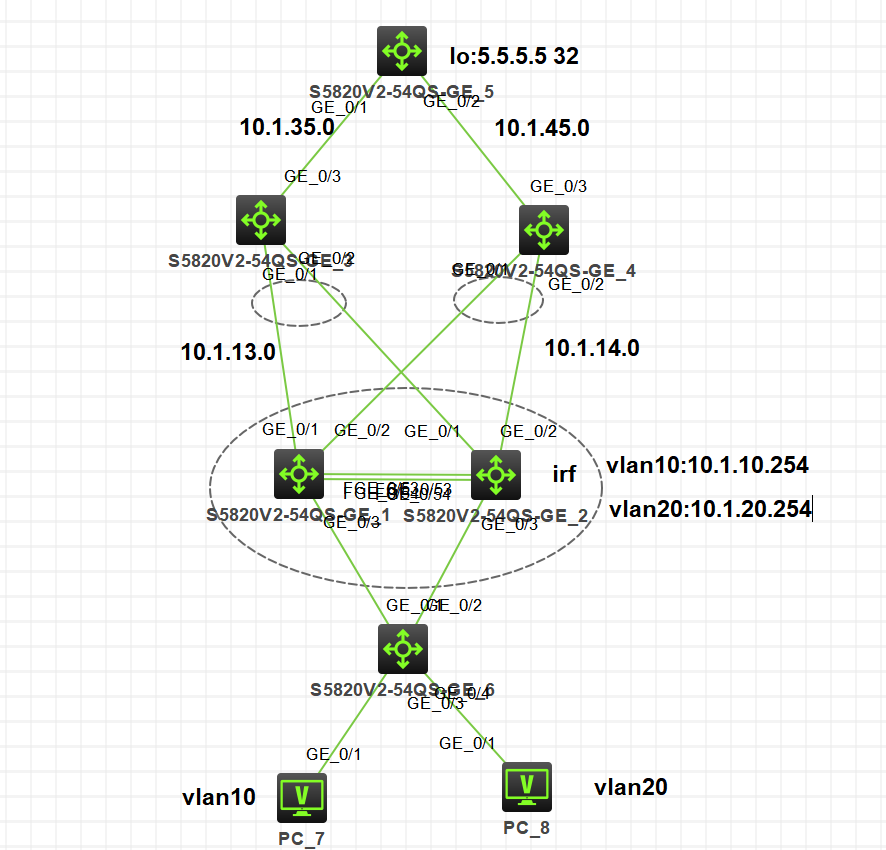 俩台pc访问5.5.5.5 vlan10走左边上去 vlan20 走右边上