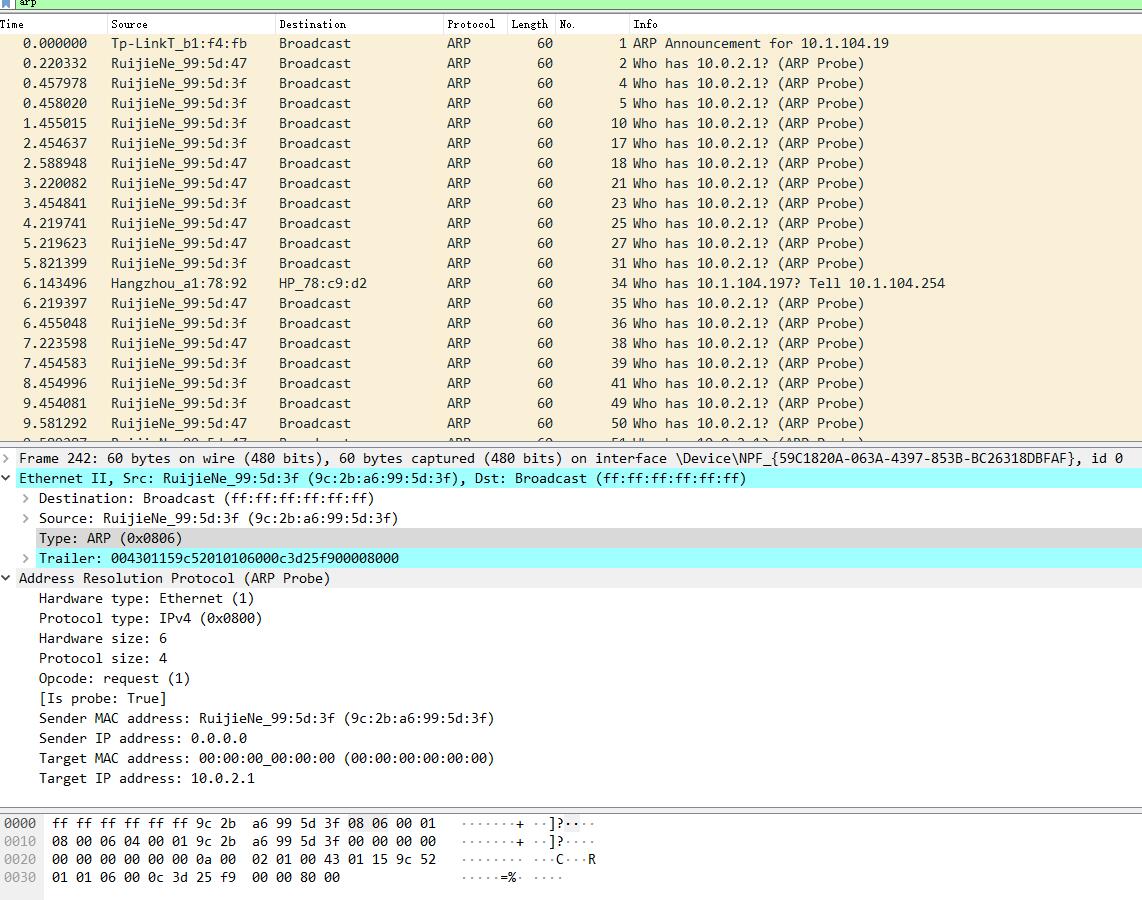 不好意思 ,各位大佬,借用下贵宝地。单位网段是10.1.104.X/24,用WireShark抓包,网络中有30%的这种ARP包,其中RuijieNe_9c:2b:a6:99:5d:3f和RuijieNe_9c:2b:a6:99:5d:47是两台交换机,未配置IP地址,10.0.2.1是DNS服务器。这网络是不是有问题?这种包没看到回应,是不是正常的IP冲突检测?还是内网中有电脑中了病毒?谢谢