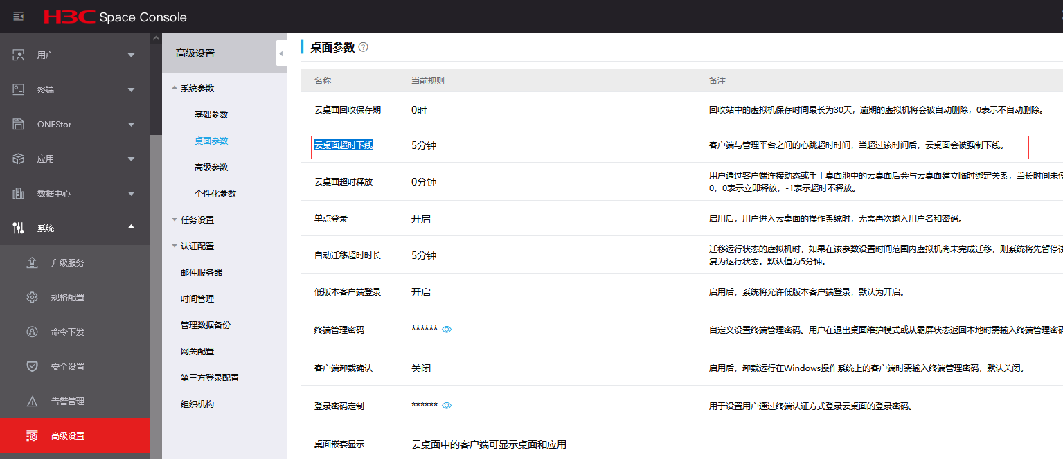 在系统-高级设置-桌面设置里面。把 云桌面超时下线 设置时间久一点就可以了。