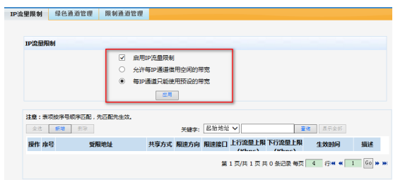 1、启用IP流量限制功能,并设置您所需的限制方式:勾选【启用IP流量限制】,选择【每IP通道只能使用预设的带宽】,单击【应用】按钮生效。
