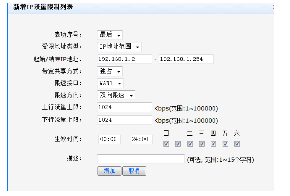 2、添加限速规则:单击【新增】按钮,在弹出的对话框中设置限速规则,单击【增加】按钮完成操作。例如:对内网192.168.1.0网段的每个IP进行1024Kb/S的限速,则配置如下图: