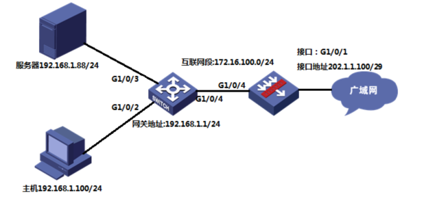 [H3C-GigabitEthernet1/0/1]nat server protocol tcp global 202.1.1.100 8081 inside 192.168.1.88 8081 //配置nat映射, 将公网地址202.1.1.100、协议tcp、端口8081,映射到内部服务器192.168.1.88的8081端口