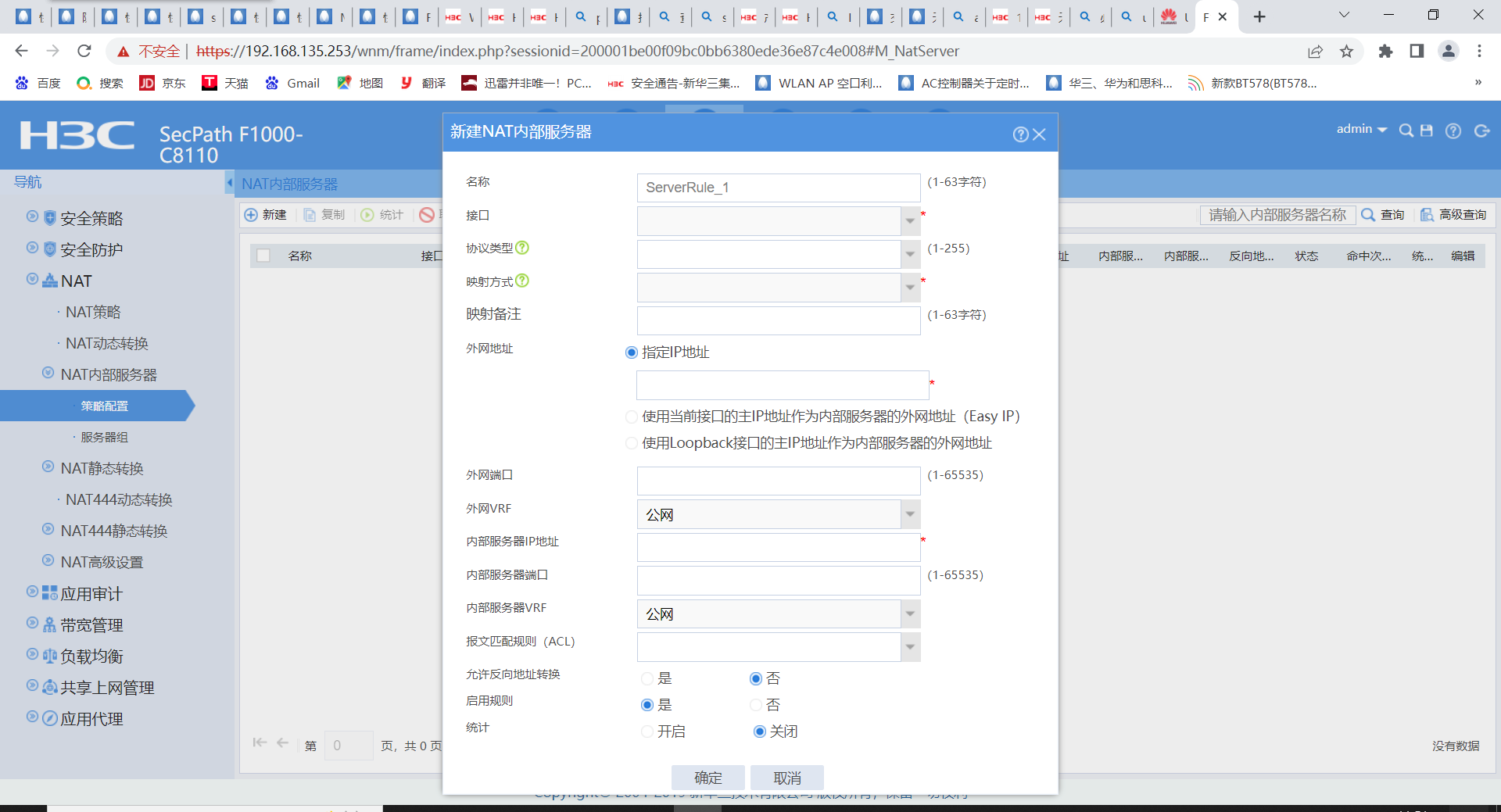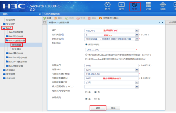 #选择“策略”>“NAT”>“NAT内部服务器”>“策略配置”点击“新建”,“接口”选择外网口1/0/1,“协议类型”选择6(TCP协议),“外网地址”填写1/0/1接口真实地址,“外网端口”填写要发布的8081端口,“内网服务器IP地址”添加真实服务器地址,“内部服务器端口”填写8081端口