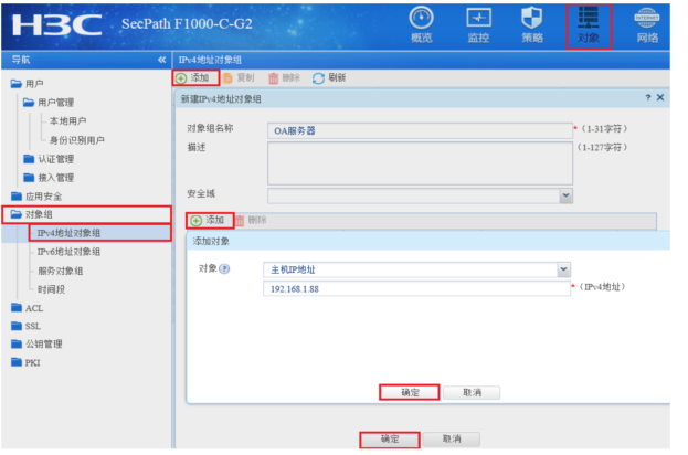 #创建地址对象:点击“对象”>“对象组”>“IPV4地址对象组”添加IPV4地址对象。“对象”选择“主机IP地址”填入服务器IP地址192.168.1.88。