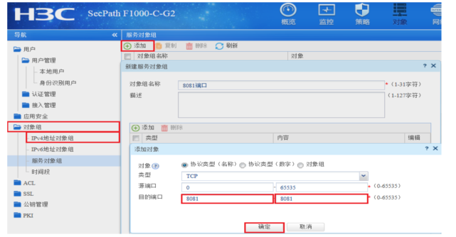 #创建服务器对象:“点击”>“对象”>“对象组”>“服务对象组”添加服务对象,“对象选择”协议类型”,“目的端口”起始终止端口均选择8081。
