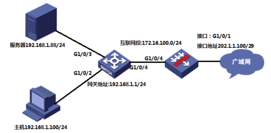 #在外网口GigabitEthernet1/0/1上配置内部服务器映射:允许外网用户通过公网地址202.1.1.100、端口8081访问内部服务器192.168.1.88的8081端口