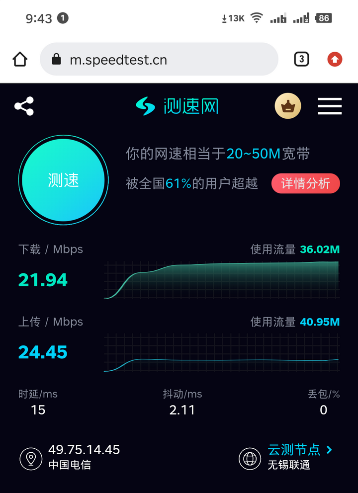今天换了其他办公室,测下来数据差不多,也是54m,下载也只有20m左右