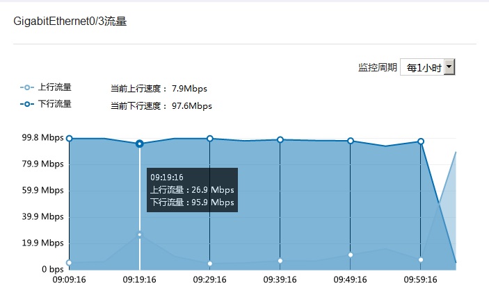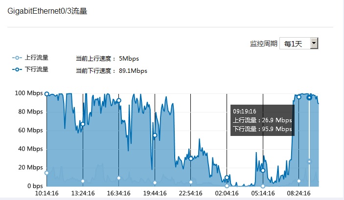 监控周期为每小时或每天时,下行流量都不超100Mbps