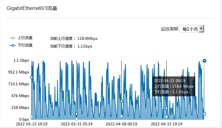 监控周期:每个月,显示下行流量:1.1Gbps