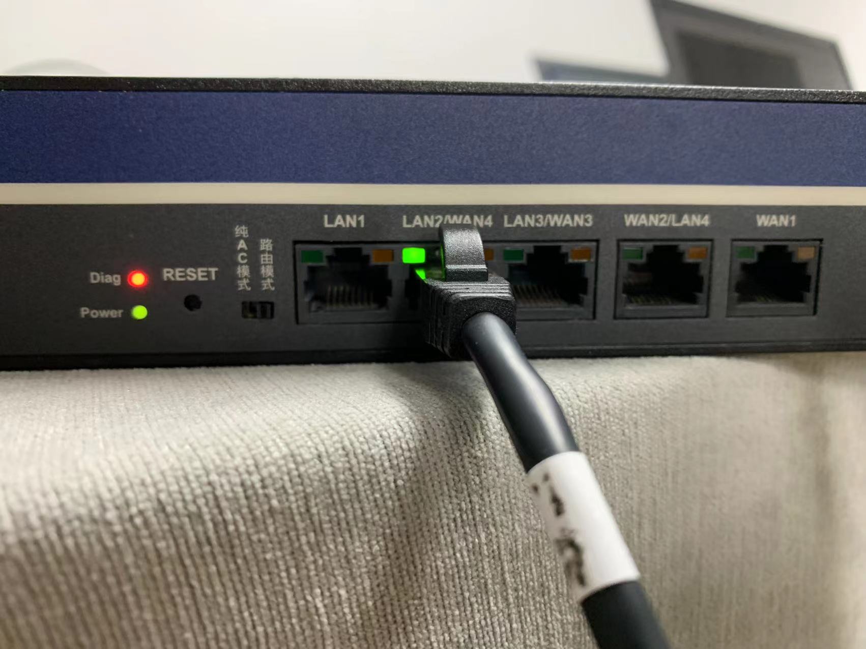 diag灯亮是有问题的,照片来看,端口还能up,试试电脑配静态地址,比如配192.168.1.99进192.168.1.1,能不能进emergency界面,能进去的话可以刷固件刷回来。如果始终进不去界面的话在保建议走备件了