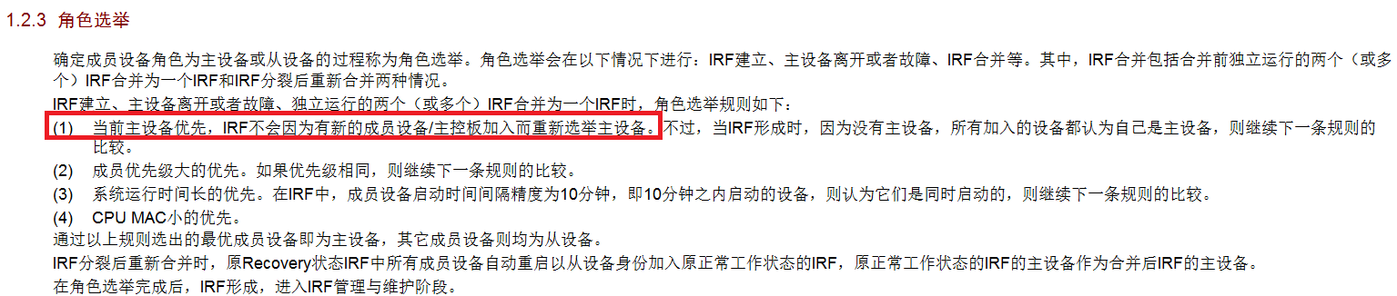 IRF建立、主设备离开或者故障、独立运行的两个(或多个)IRF合并为一个IRF时,角色选举规则如下: