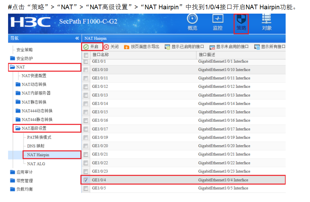 [H3C-GigabitEthernet1/0/4]nat hairpin enable //开启Nat Hairpin功能