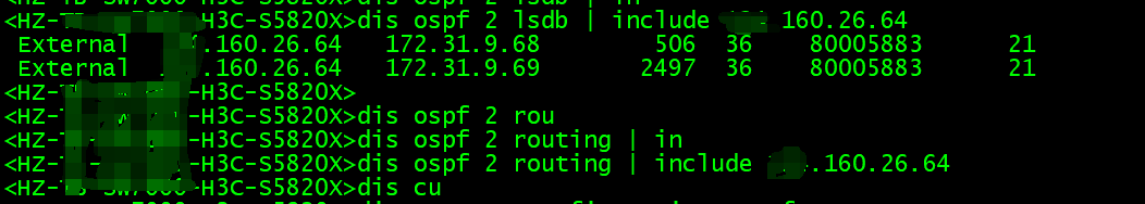 OSPF是多进程多实例里ospf,邻居都正常,ospf lsdb里也可以学到网段信息,但是ospf routing里没有信息,VPN里的路由表里也没有。