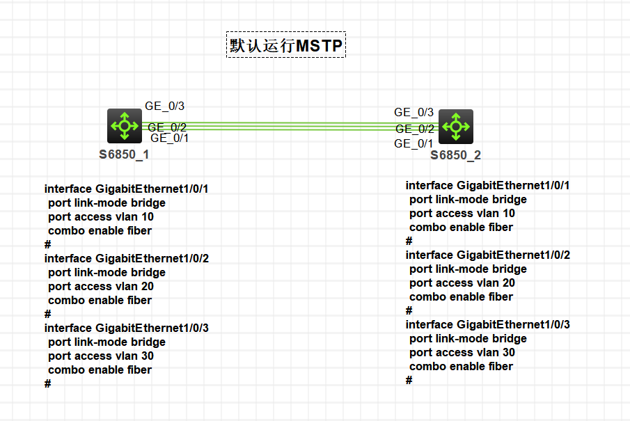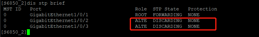 两台交换机多链路互联,每条链路划分到不同vlan,查看接口stp状态,默认运行MSTP,默认实例0。