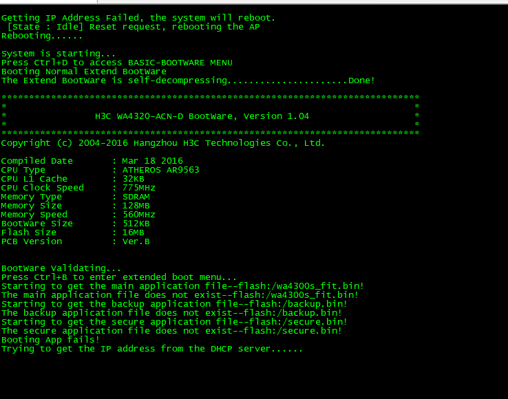 WA4320-ACN-D无法进入BOOTROM,ctrl+B没反应,之前是把胖改为瘦,现在想把瘦改回胖但一直进不去BOOTROM求帮助!!!!!