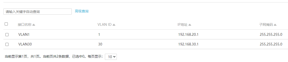 路由器配置了2个子网,VLAN1和VLAN30,IP地址如下。