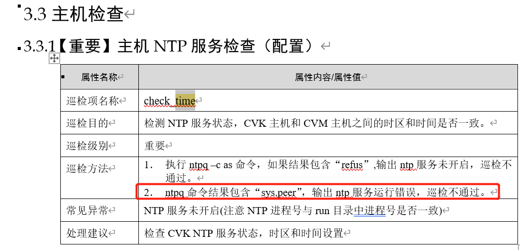 通过巡检脚本发现ntp巡检项有问题,看了下ntp服务运行没问题,指导书里写着 ntpq命令结果包含“sys.peer”, 输出ntp服务运行错误 ,巡检不通过。主机上命令结果确实包含这个,需要如何处理?