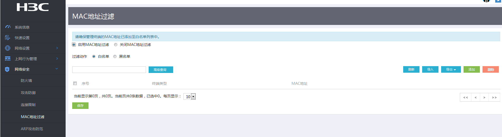 下面就是mac地址过滤的界面,使用白名单,把需要上网的mac加进去就可以了