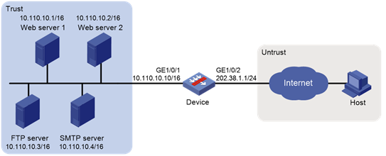 [Device-GigabitEthernet1/0/2] nat server protocol tcp global 202.38.1.1 80 inside 10.110.10.1 http