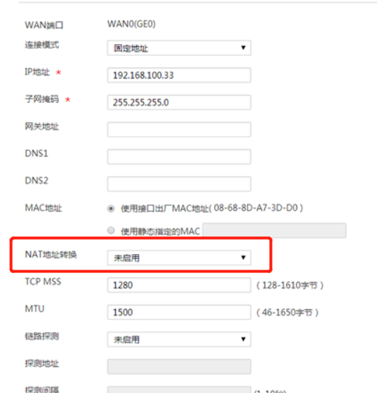 修改WAN配置的时候,NAT地址转换你选择不启用就管理了NAT了,但是你关闭NAT后,对端要有到你内网地址段的路由才可以,要不,你内网地址不能和外部互访了