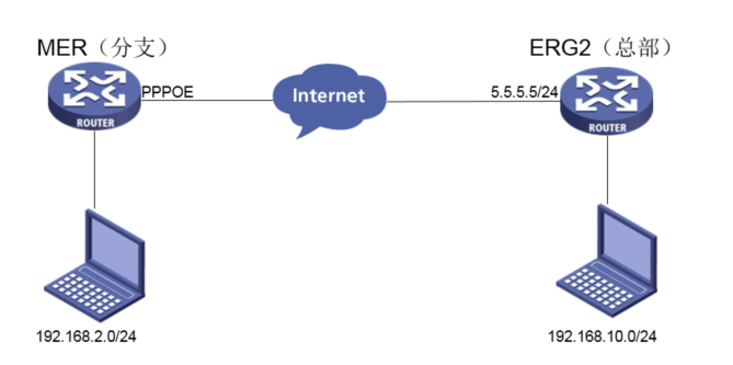 在总部和分部之间分别建立安全隧道,对客户总部PC1所在的子网(192.168.10.0)与客户分支机构PC2所在的子网(192.168.2.0)之间的数据流进行安全保护。安全协议采用ESP协议,加密算法采用3DES,认证算法采用MD5,ERG2作为总部,MER作为分部。