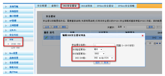 #选择【VPN】--【IPSEC VPN】--【IKE安全提议】。单击【新增】按钮,设置验证算法和加密算法分别为MD5、3DES,DH组选择DH2,单击【增加】。