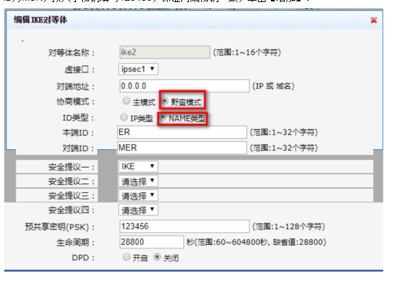 #选择【VPN】--【IPSEC VPN】--【IKE对等体】。单击【新增】按钮,选择野蛮模式,选择对应的虚接口,对端地址填写0.0.0.0。在“ID类型”选择NAME,本端ID为ER,对端ID为MSR,预共享秘钥填写123456,保证两端秘钥一致,单击【增加】。