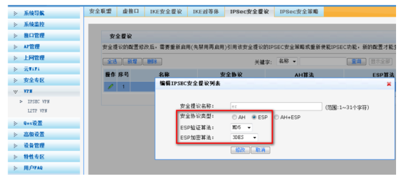#选择【VPN】--【IPSEC VPN】--【IPSEC安全提议】。单击【新增】,选择安全协议类型为ESP,并设置验证算法和加密算法分别为MD5、3DES,单击【增加】。