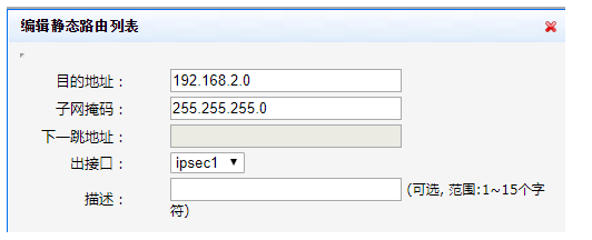 #为经过IPSec VPN隧道处理的报文设置路由,才能使隧道两端互通(一般情况下,只需要为隧道报文配置静态路由即可)。选择【高级设置】--【路由设置】--【静态路由】,单击【新增】,目的地址填写 192.168.2.0,出接口选择ipsec1。