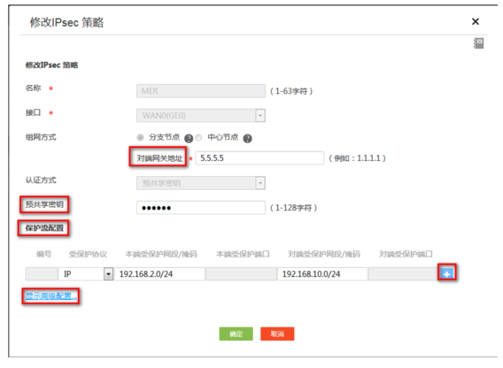 #选择分支节点,对端地址填写5.5.5.5,预共享秘钥为123456,保证两端秘钥一致,配置保护流,本端地址为192.168.2.0/24,对端地址为192.168.10.0/24,并点击高级设置进行下一步设置。