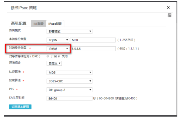 #IKE配置,协商模式选择野蛮模式,本端身份类型选择FQDN,填写MER,对端身份类型选择IP地址,填写5.5.5.5,认证算法,加密算法,PFS分部为MD5,3DES-CBC,DH2,保证与ERG2侧一致。