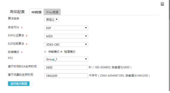 #IPsec配置,安全协议选择ESP,认证算法MD5,加密算法3DES-CBC,PFS为Group1,算法保证与ERG2保持一致。