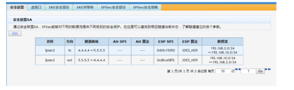 #ERG2侧,点击【VPN】--【IPSEC VPN】--【安全联盟】,查看ipsec隧道信息。