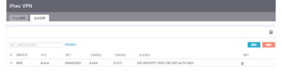 #MER侧,点击【虚拟专网】--【IPsec VPN】--【监控信息】,查看ipsec隧道信息。