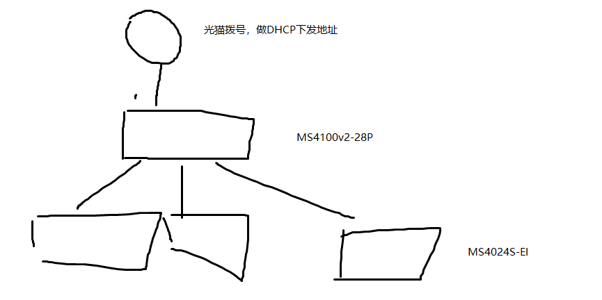 光猫拨号,下挂一台傻瓜MS4100V2-28P,然后MS4100v2到各个楼层间的MS4024S-EI。无法恢复网络后,在MS4100v2-28P下重新加了一台8口的小交换机,然后将PC的线路接到新加的小交换机上网络正常恢复。