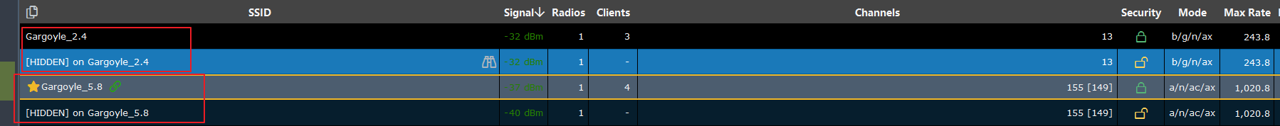 如图所示,使用wifi监测软件,发现2.4和5g频段,都会多一个隐藏的ssid。目前2.4g指定的是20Mhz,5.8g指定的是80Mhz频宽