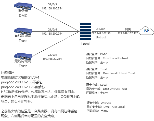 拓扑图的防火墙位置之前放的是MER8300路由器,没有存在丢包问题,也能正常上网。换了防火墙后,存在丢包问题。